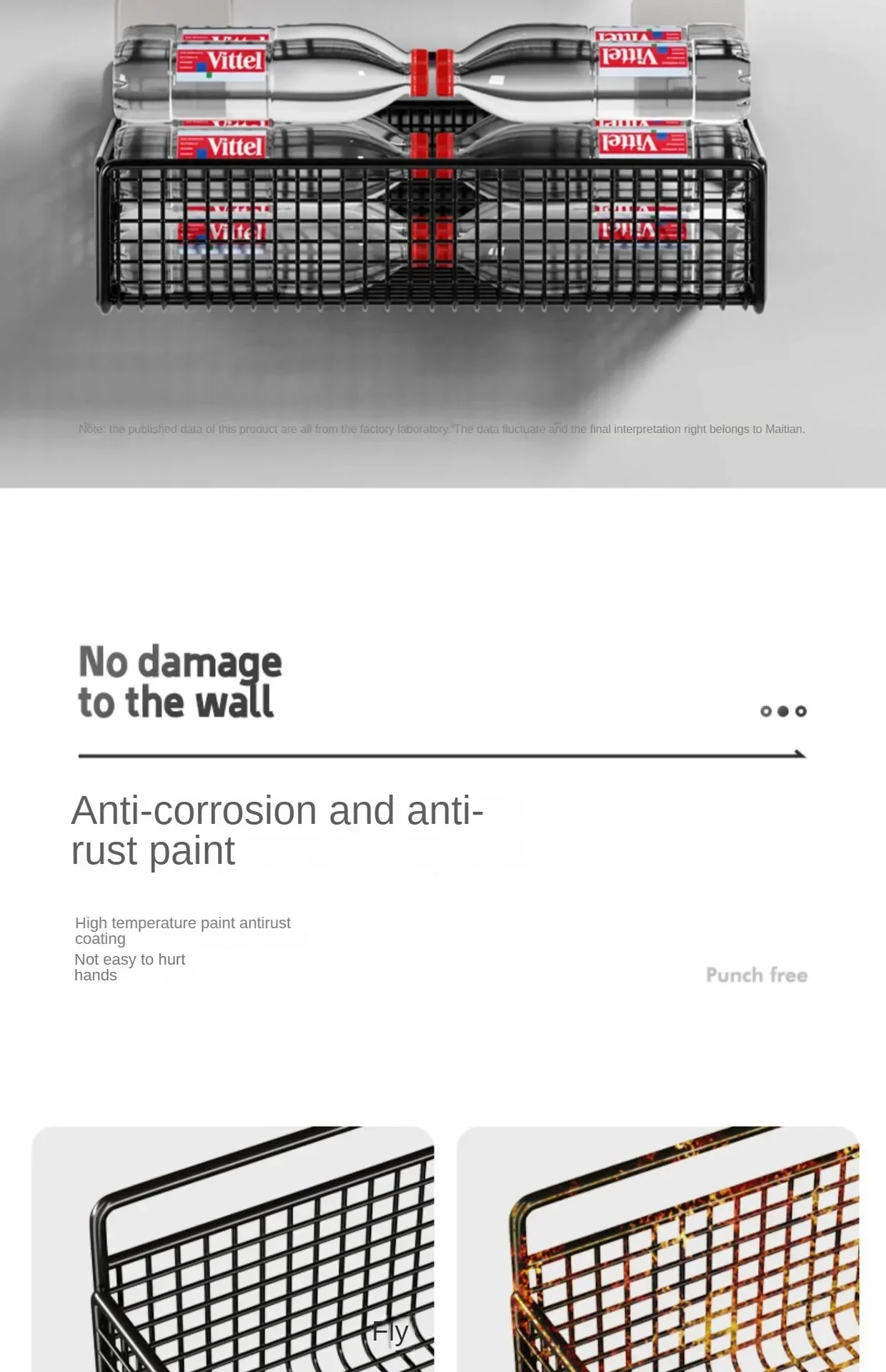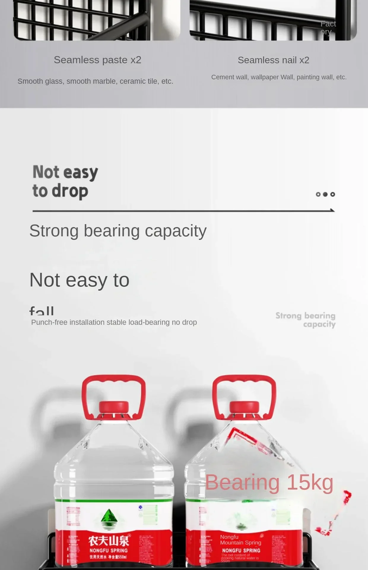 Tipo de instalación: Sin taladrar / sin perforaciones (no-punch). Se fija con adhesivo fuerte o tornillos insertados (bolt inserting), pero principalmente tipo “pegado” o de pie apoyado en la pared.